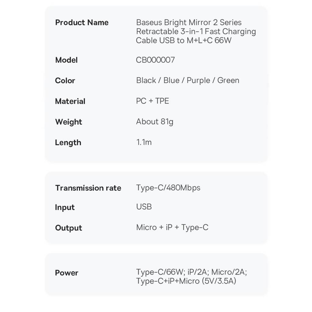 Specyfikacja techniczna kabla USB 3w1 Baseus Bright Mirror 3