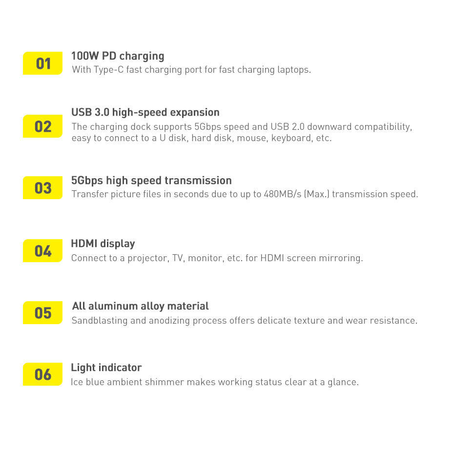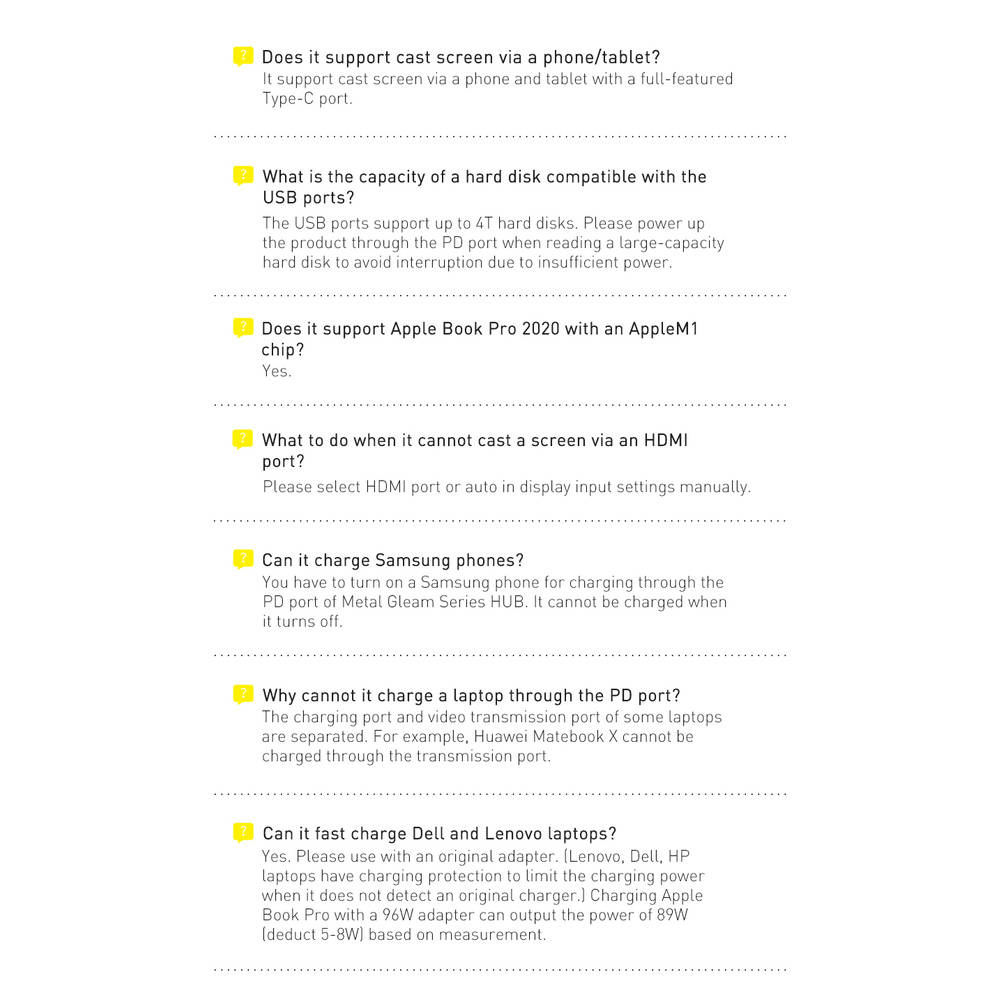Adapter 5w1 Baseus jest kompatybilny z różnymi urządzeniami, takimi jak laptopy, komputery, tablety, smartfony, które posiadają port USB-C. Co więcej, jest to urządzenie typu Plug & Play, co oznacza, że nie wymaga instalacji żadnych sterowników. Wystarczy podłączyć adapter do urządzenia, a następnie podłączyć do niego akcesoria, które chcesz używać. Wskaźnik LED poinformuje Cię o poprawnym działaniu urządzenia.