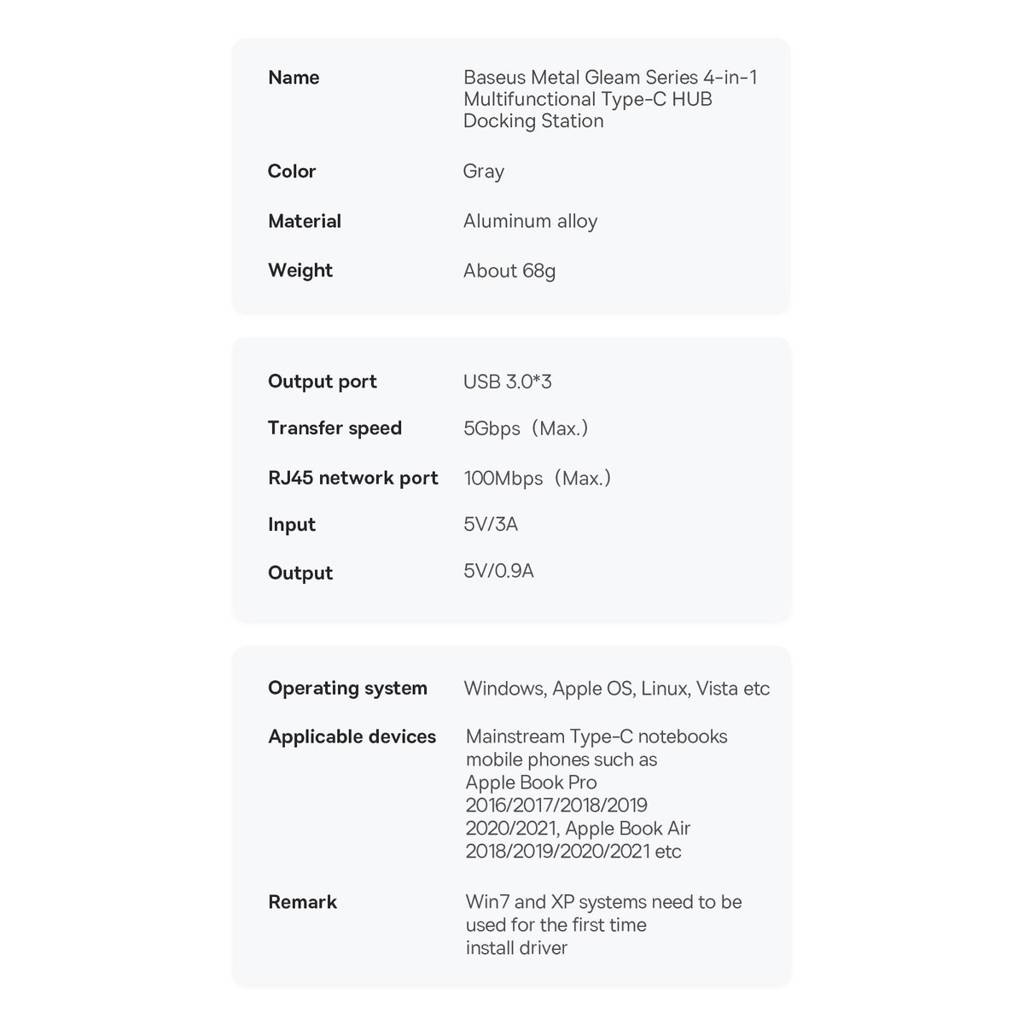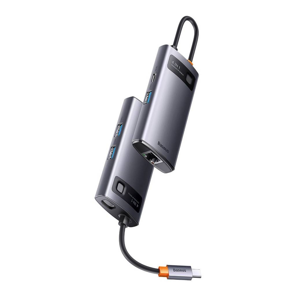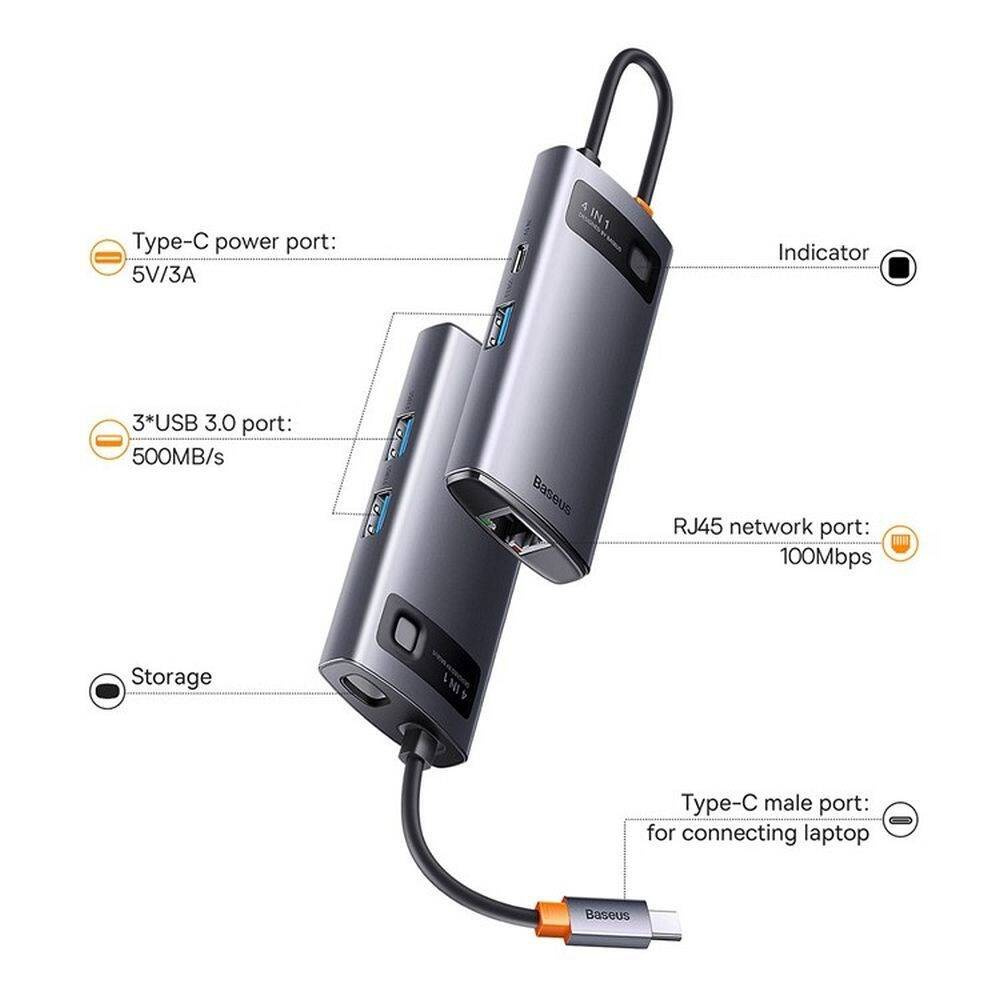 Baseus Metal Gleam Series stacja dokująca HUB 4 w 1 USB Typ C - 3 x USB 3.2 Gen. 1 / RJ45 (WKWG070113)