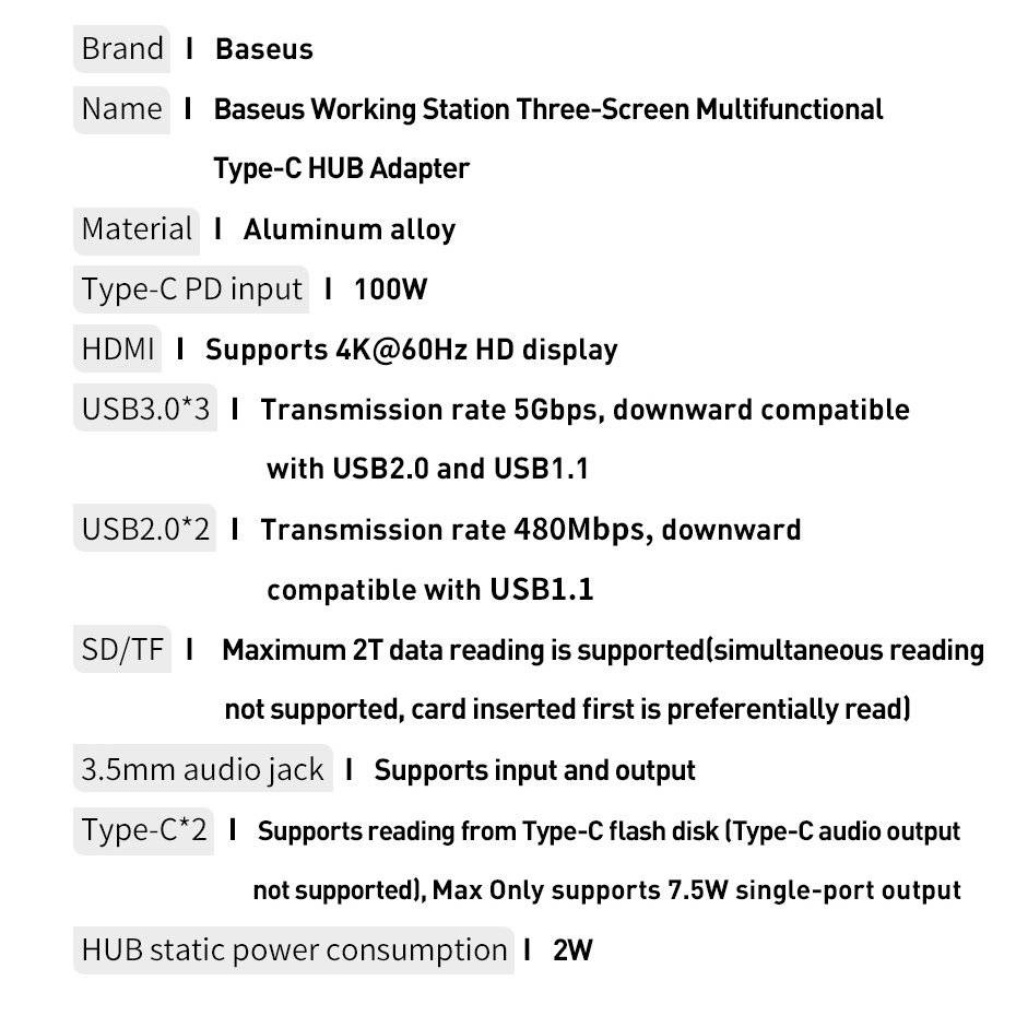 Baseus wielofunkcyjny HUB 3x USB 3.2 Gen 1 / 2x USB 2.0 / 2x USB Typ C / czytnik kart SD i micro SD / AUX / 3x HDMI / RJ45 1Gbps Power Delivery 100W (wtyczki EU / CN / UK) szary (CAHUB-DG0G)