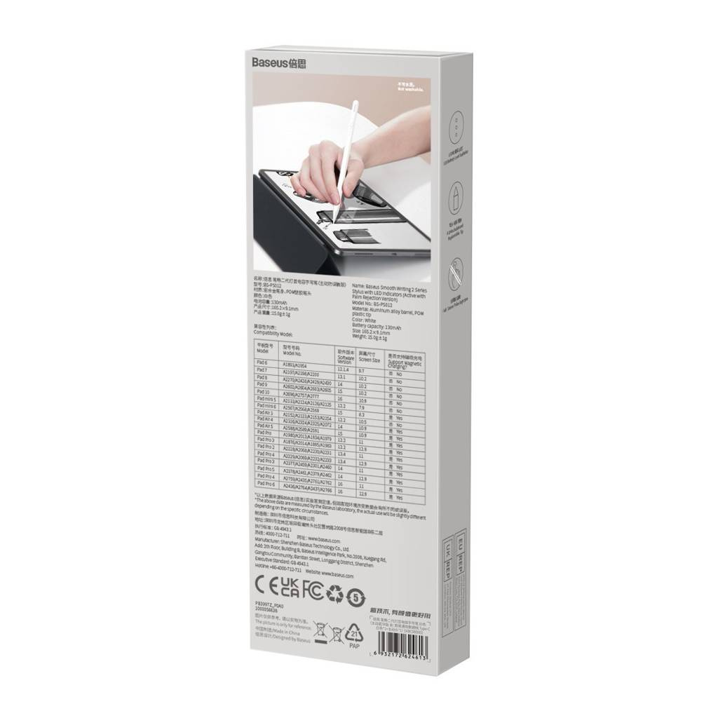 Baseus Smooth Writing 2 to rysik o wymiarach 165 x 9 mm, ważący zaledwie 13,5 g. Jest kompatybilny z wieloma modelami iPadów, a jego pojemność baterii wynosi 130 mAh. W zestawie z rysikiem znajduje się wymienna końcówka. Rysik obsługuje pisanie pod różnymi kątami: 45°, 60° i 90°, co wpływa na precyzję i grubość kreski. Czas użytkowania to do 10 godzin pracy lub do 12 miesięcy w trybie czuwania.