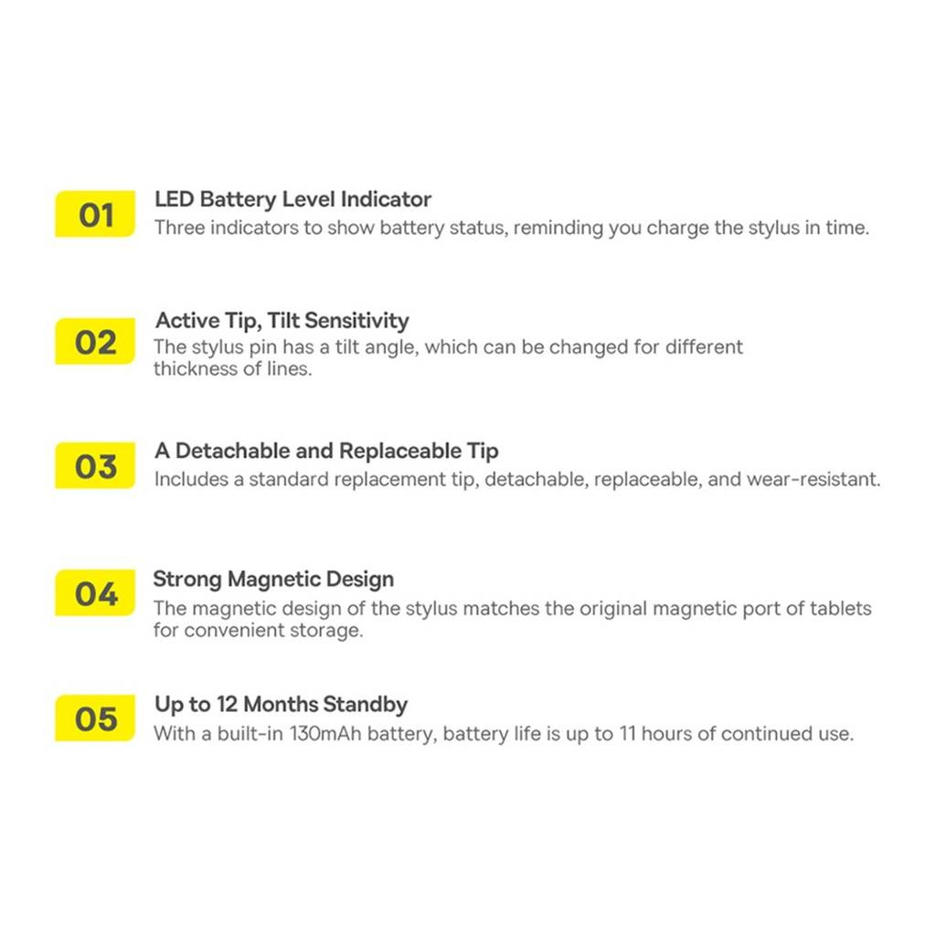 Rysik Baseus Smooth Writing 2 to gwarancja długiego i bezproblemowego użytkowania. Dzięki pojemności 130 mAh, jedno ładowanie zapewnia do 10 godzin ciągłej pracy lub nawet 12 miesięcy czuwania w trybie standby. Rysik jest łatwy do naładowania, a na tablecie wyświetlany jest komunikat o stanie naładowania baterii. To praktyczne rozwiązanie, które pozwala na wygodne planowanie czasu pracy.
