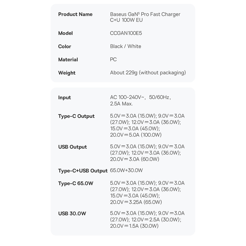 Baseus GaN5 Pro szybka uniwersalna ładowarka sieciowa GaN USB Typ C / USB 100W PD3.0, QC4.0+, AFC biały (CCGP090202)