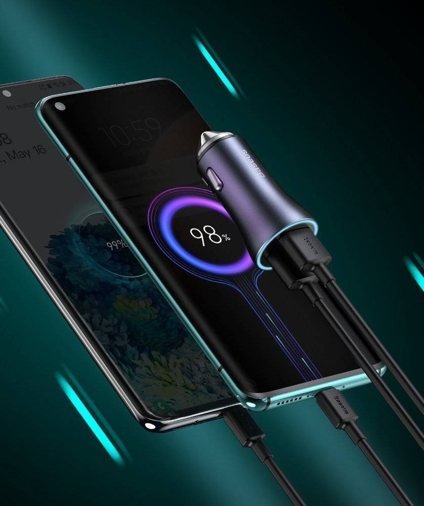 Ładowarka samochodowa Baseus Golden Contactor Pro oferuje możliwość ładowania dwóch urządzeń jednocześnie, bez obaw o spowolnienie tempa ładowania. Wyposażona w dwa porty - USB i USB-C, pozwala na ładowanie różnych typów urządzeń. Dzięki technologii BPS II, ładowarka inteligentnie i automatycznie dobiera napięcie oraz moc dla obu podłączonych urządzeń, gwarantując optymalne ładowanie. W zestawie znajduje się także kabel USB-C do Lightning o długości 1 m, co pozwala na jeszcze większą kompatybilność.