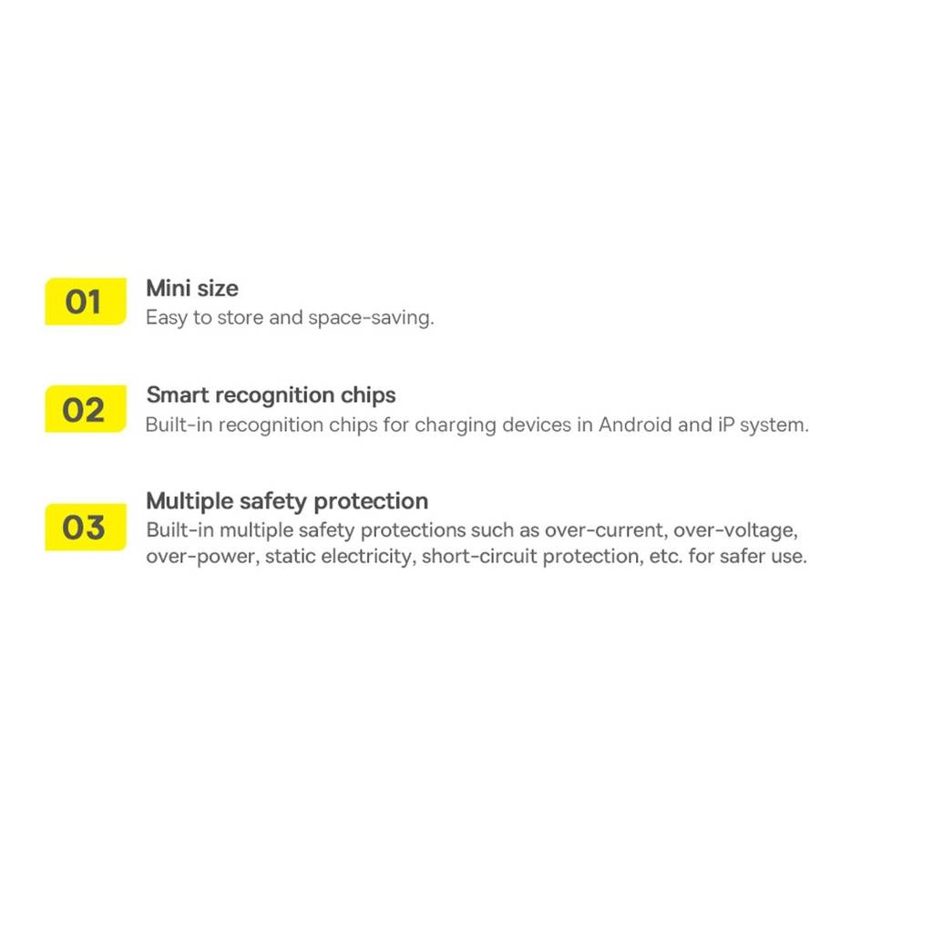 Specyfikacja techniczna: - Marka: Baseus - Model: Compact - Kolor: Biały - Ilość gniazd USB: 3 - Wydajność: 17W - Napięcie wejściowe: AC 100-240V - Napięcie wyjściowe (USB1/USB2/USB3): 5V = 2.4A - Napięcie wyjściowe (USB1+USB2/USB2+USB3): 5V = 3.4A - Waga: 58.5g - Wymiary: 40x28x63.9mmParametry produktu