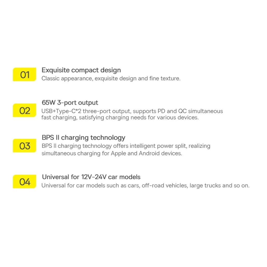 Masz telefon obsługujący protokół szybkiego ładowania? Ta ładowarka samochodowa Baseus wspiera technologie Quick Charge 4+, AFC (Samsung Adaptive Fast Charging), FCP (Huawei Fast Charger Protocol), SCP (Huawei SuperCharge Protocol).