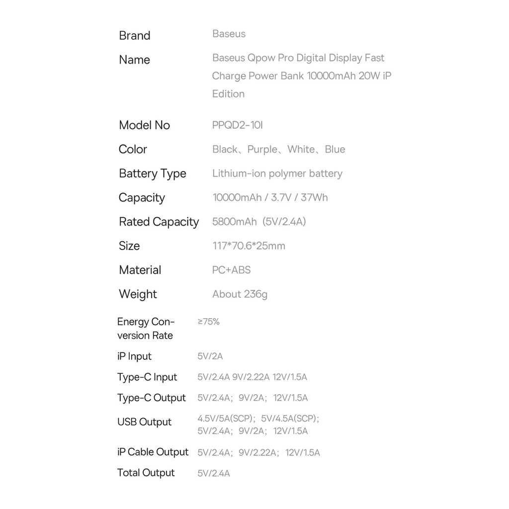 [PO ZWROCIE] Powerbank 10000mAh 20W Baseus Qpow Pro Overseas Edition + kabel USB C 3A - czarny