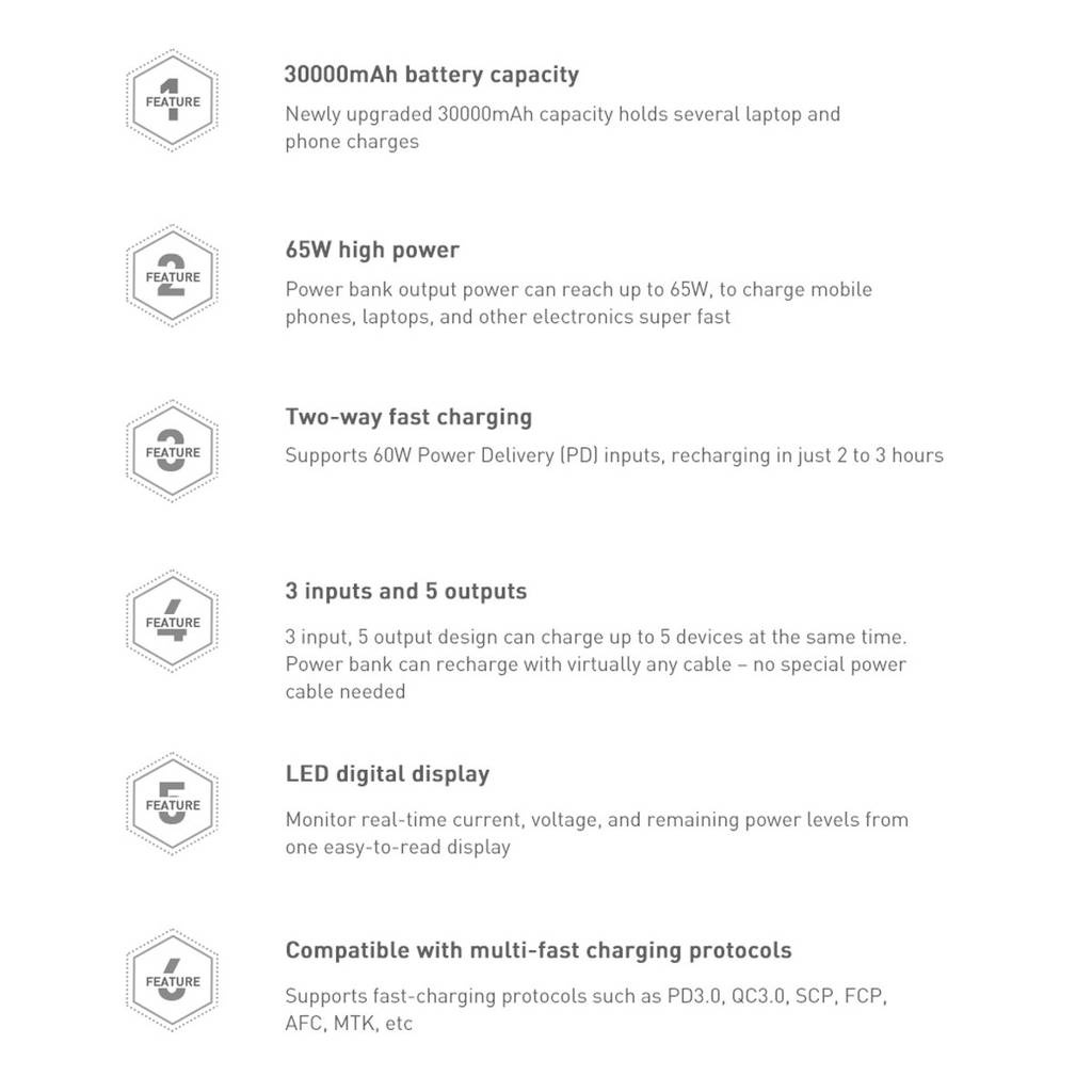 Powerbank Baseus Amblight to nie tylko doskonały partner smartfonów, ale także sprzętów większego kalibru. Dzięki portowi USB-C PD, z dobrodziejstw powerbanku może skorzystać również Twój MacBook czy inny laptop. To doskonałe rozwiązanie dla osób, które często korzystają z laptopa w miejscach, gdzie dostęp do prądu jest ograniczony.