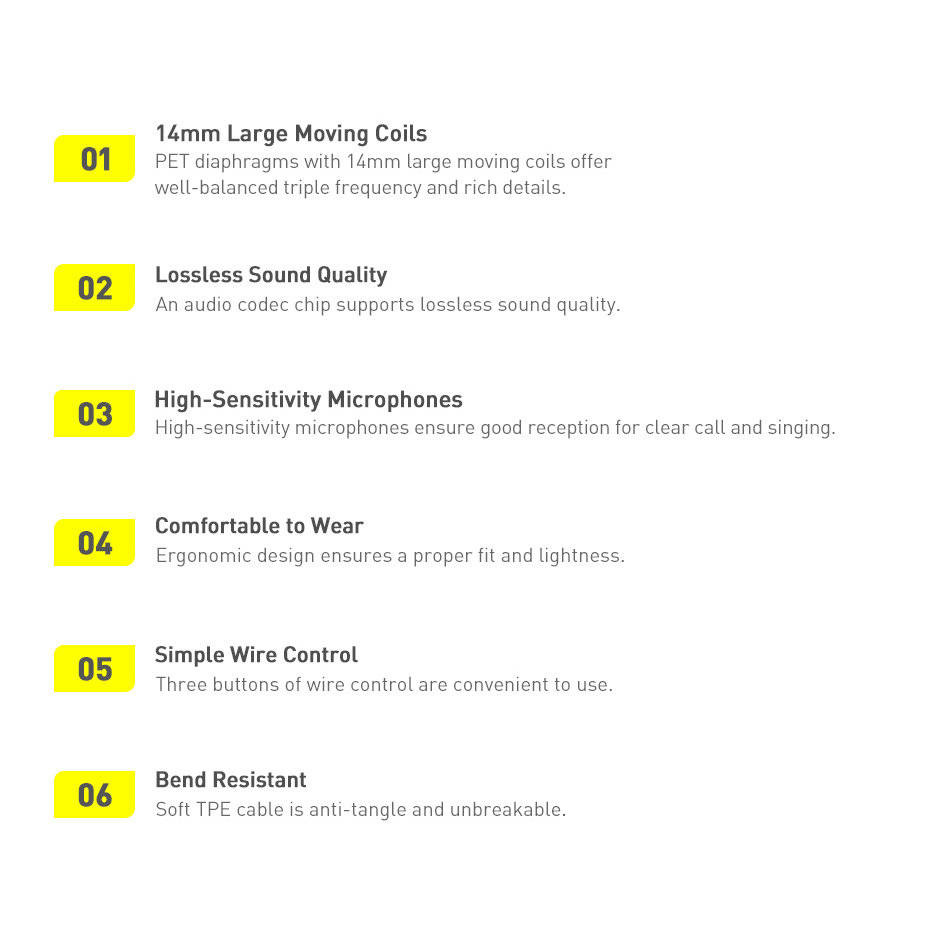 Słuchawki Baseus Encok C17 są wyposażone w praktyczny pilot umieszczony na kablu. Pozwala on na błyskawiczne przełączanie się między piosenkami, kontrolę głośności oraz odbieranie rozmów telefonicznych za pomocą jednego przycisku. Wielokierunkowy mikrofon o wysokim stopniu czułości gwarantuje krystalicznie czysty przekaz dźwięku, a specjalny chip dba o stałą jakość w czasie rzeczywistym. Dzięki temu, nawet podczas intensywnego użytkowania, nie odczujesz żadnych spadków czy zacięć.