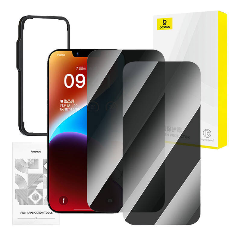 Prywatyzujące szkło hartowane Baseus Superior dla iP 14 Plus/13 Pro Max +2x zestaw czyszczący i EasyStick