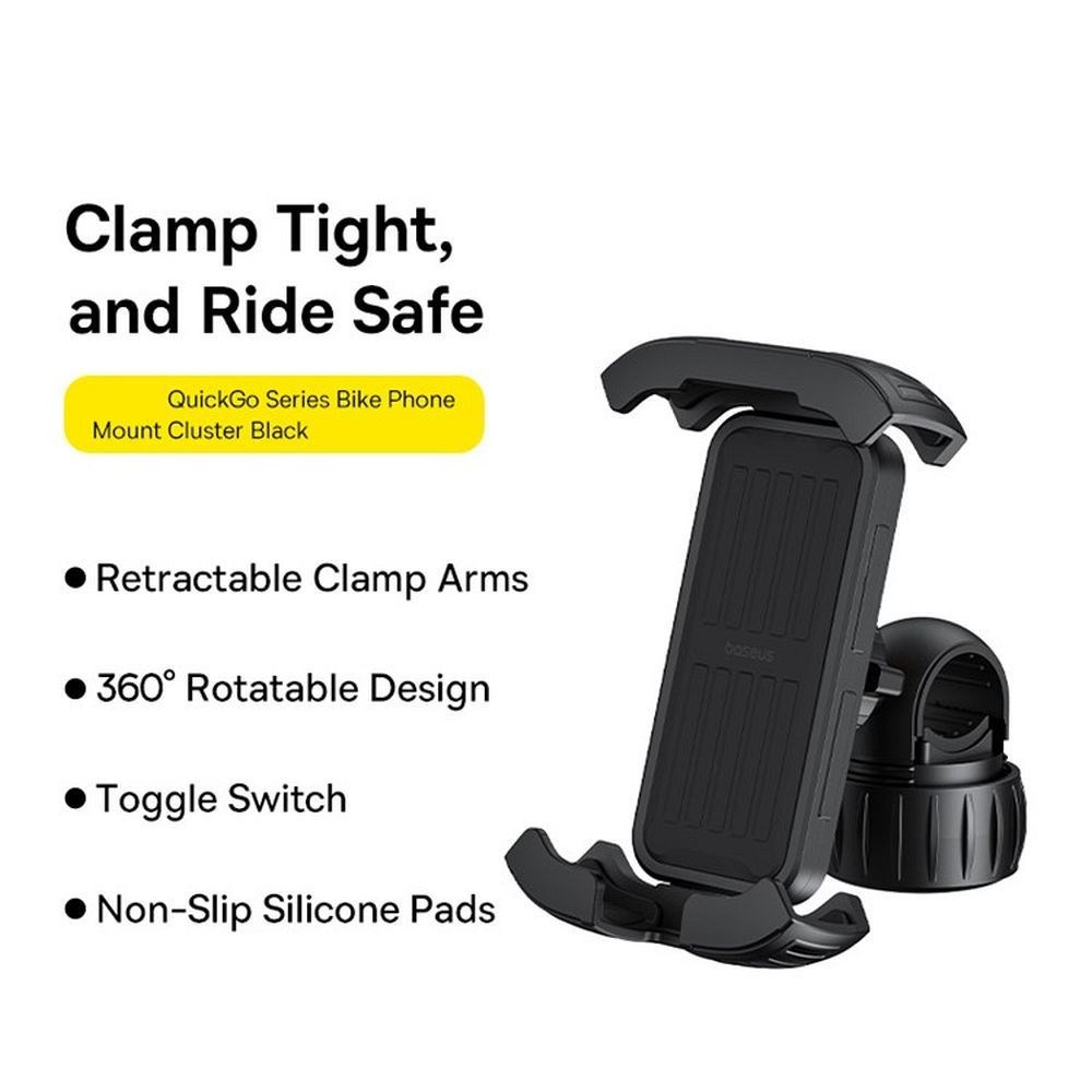 1. 2.Upgraded Design for Better Protection 2.3.360° Rotatable Design 3.Tight Clamping with Toggle Switch 4.5.Super Quick & Easy Installation Name: Baseus QuickGo Series Bike Phone Mount Model No.: BS-CM024 Material: ABS+TPU Applicable phone size: 5.4-7.2 inches Applicable handlebar size: Ф24-30mm Product size: Mount: 140*92*52mm; Tail clip: 52*72*70mm Weight: About 100g